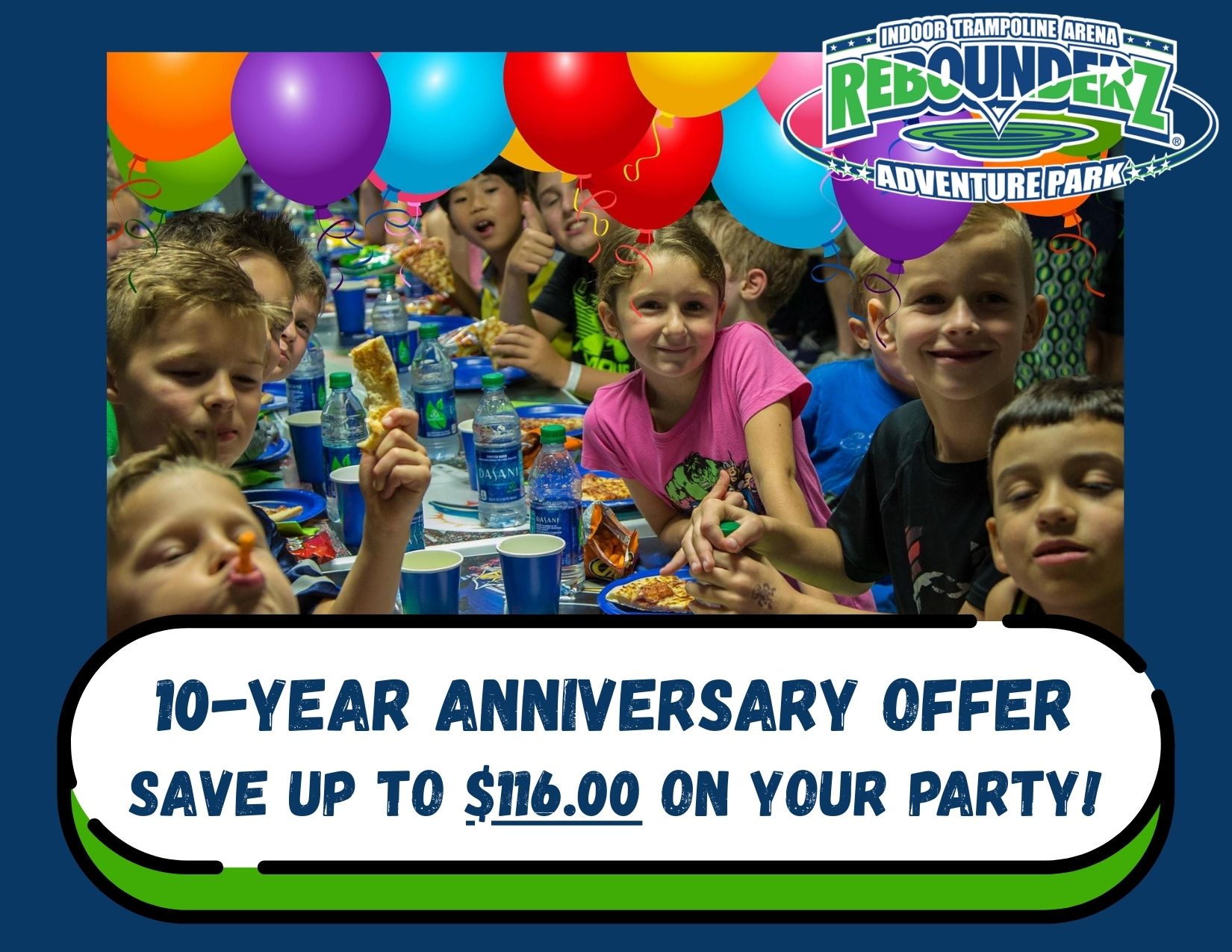 Enjoy 30% off your next Rebounderz birthday party when you use code "REWIND" at checkout! Big Savings - Bigger Fun! Limited Time Offer, Exclusions Apply.